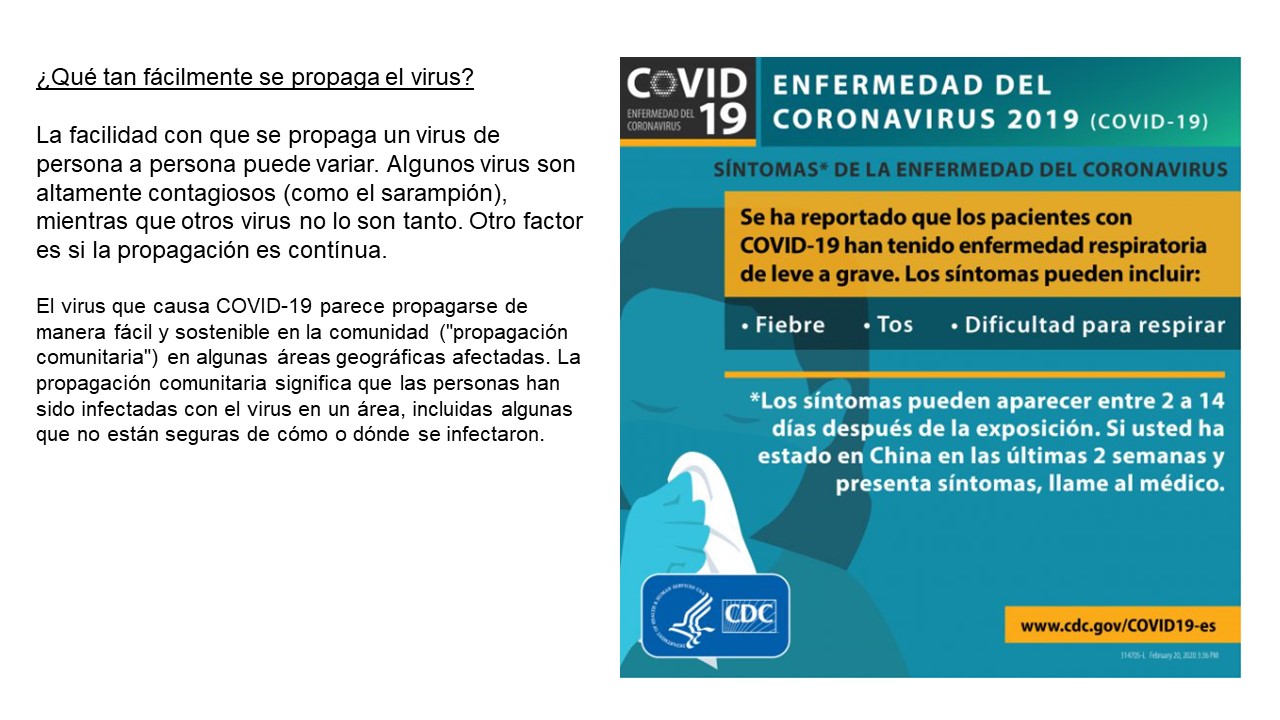 La COVID-19 es una enfermedad causada por el virus SARS-CoV-2 que se propaga entre las personas principalmente cuando una persona infectada está en contacto cercano con otra persona. How COVID-19 spreads Spanish Los conocimientos actuales sobre cómo se propaga el virus que causa la enfermedad del coronavirus 2019 COVID-19 se basan en su mayoría en lo que se sabe sobre coronavirus similares. 2-Las personas que no se alimentan bien o no se cuidan.