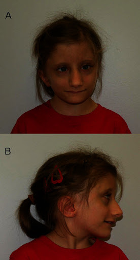 The 3-year-old girl was of proportional short stature had delay of language development conductive hearing loss and a high threshold of pain.