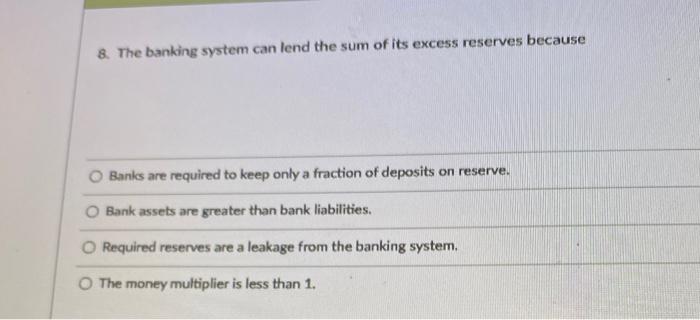 The banking system can lend the sum of its excess reserves because. The sum of balances in the clearing accounts and reserve accounts kept with the central bank. Money And Banking Important Questions. Because banks play an important role in financial stability and the economy of a country most jurisdictions exercise a high degree of regulation over banks.