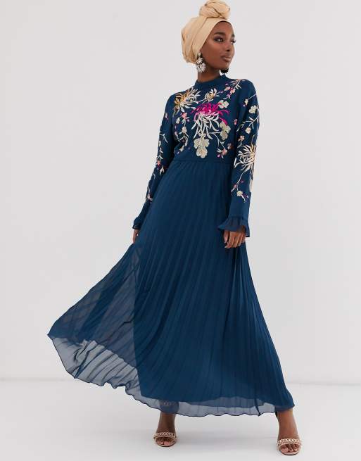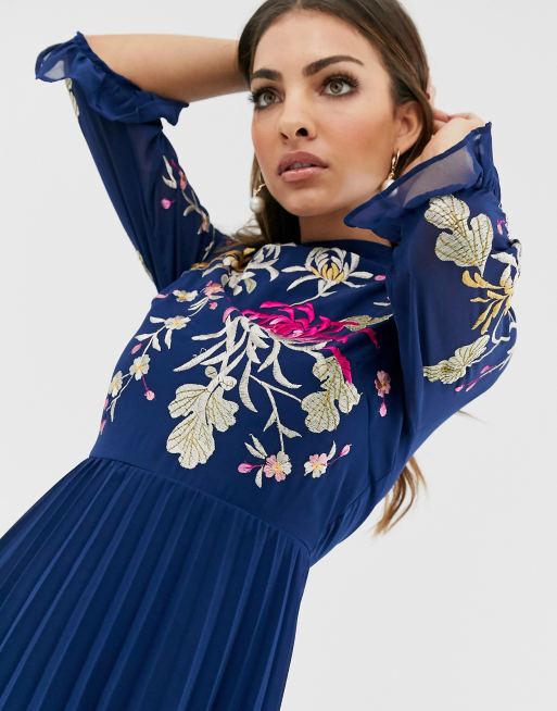 Navy Embroidered Wrap Dress. It features a cozy-yet-chic fit colorful laces.